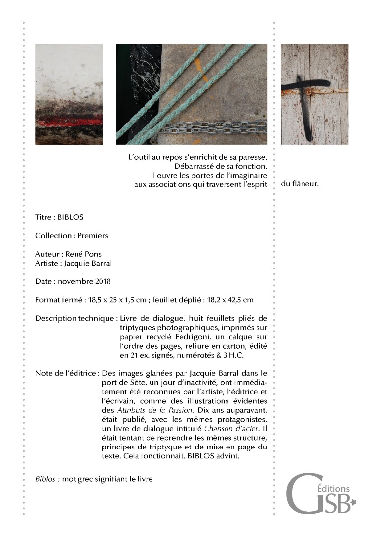 "BIBLOS", livre de dialogue entre un texte de René PONS et des photographies de Jacquie BARRAL, 21 ex.