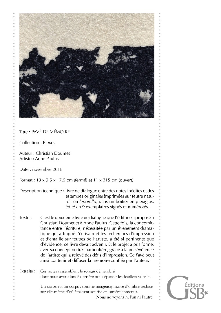 "Pavé de mémoire", livre de dialogue entre un texte de Christian DOUMET et des estampes de Anne PAULUS, 9 ex.