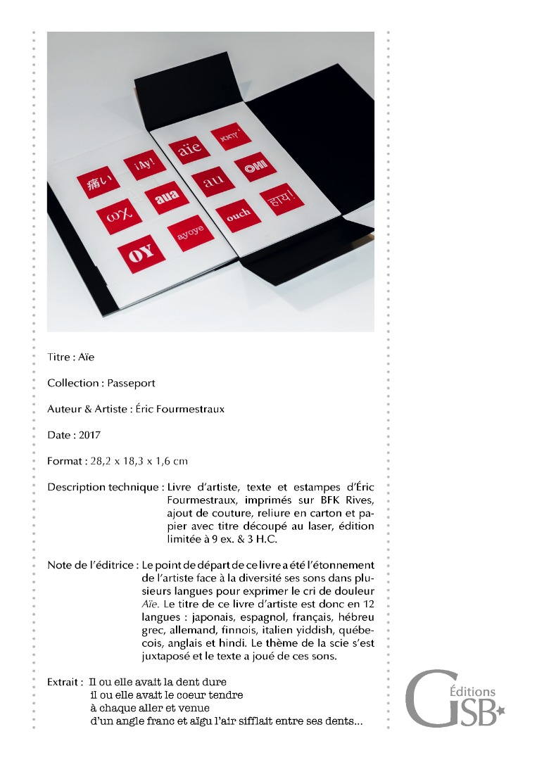 "AÏE", livre de dialogue entre un texte de Éric FOURMESTRAUX et ses estampes, 9 ex.