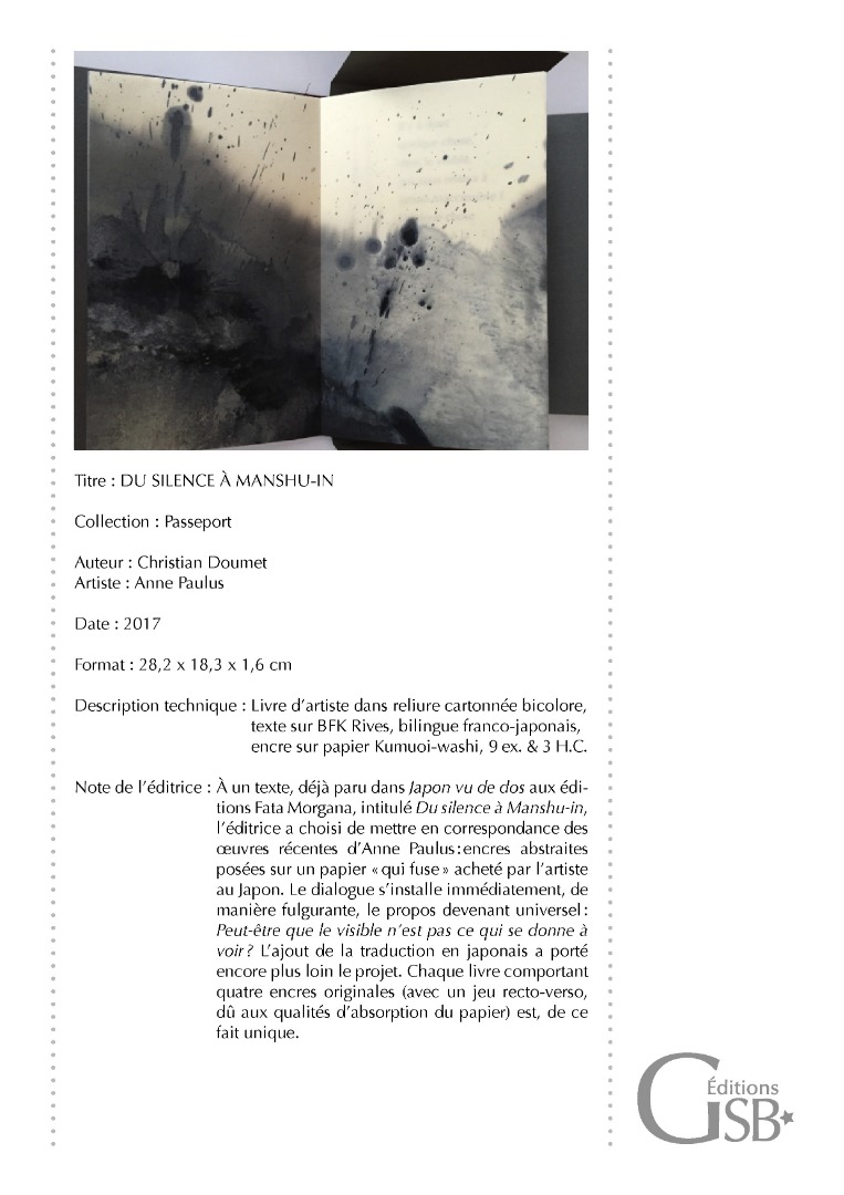"Du Silence à Manshu-in", livre de dialogue entre un texte de Christian DOUMET et des encres originales de Anne PAULUS, 9 ex.